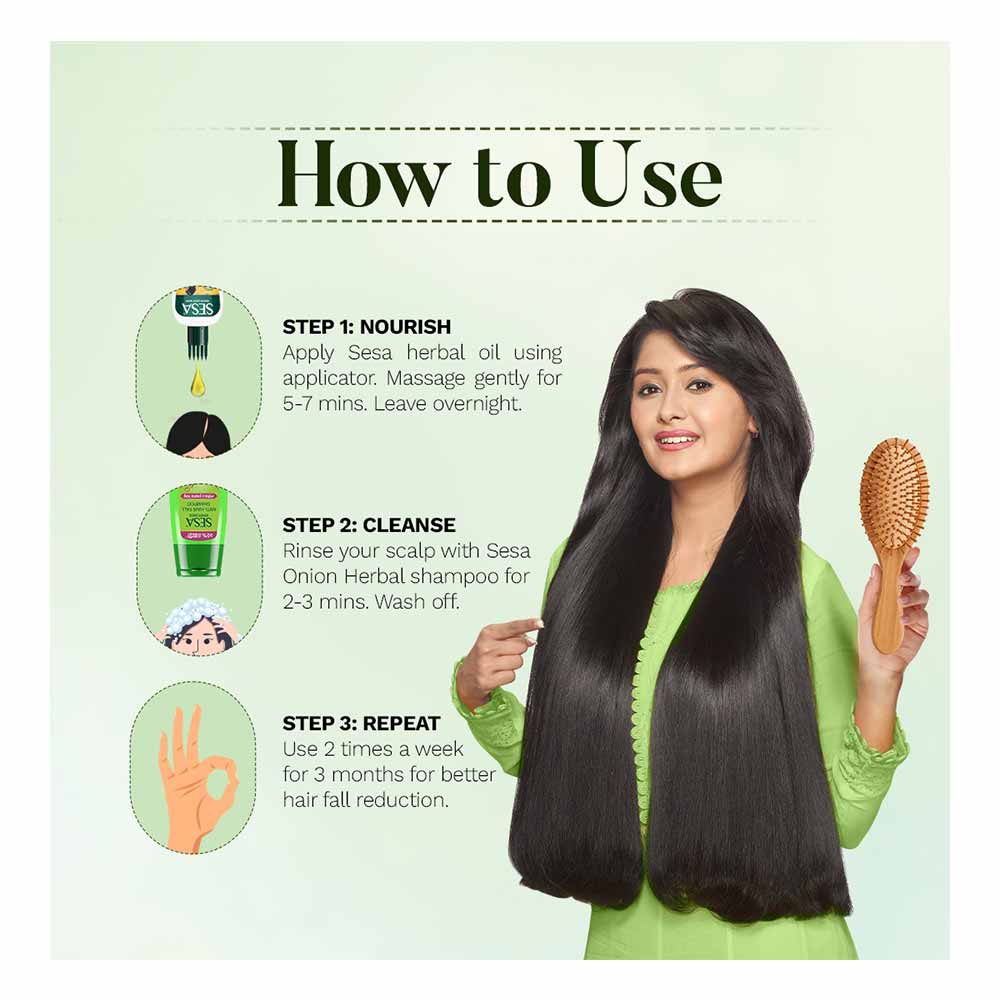 Sesa Anti-Hair Fall Shampoo is a medicinal shampoo crafted with Bhringraj, Onion, and six Ayurvedic Herbs. It helps reduce hair fall, prevent split ends, and improve hair’s shine and softness.